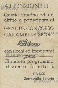Non c’erano in quel momento imprese che si dedicavano alla produzione di figurine e fu la Fidass un’Azienda dolciaria di Serravalle Scrivia a produrre una serie di calciatori, undici per ogni squadra di Serie A. Le Figurine, che avevano un formato 4×6 cm, venivano date in omaggio con le Caramelle e davano diritto a partecipare ad un Concorso con ricchi premi come descritto sul retro delle stesse.