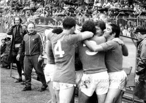 11/05/1975 i giocatori della Fiorentina festeggiano dopo una rete (Foto TORRINI)